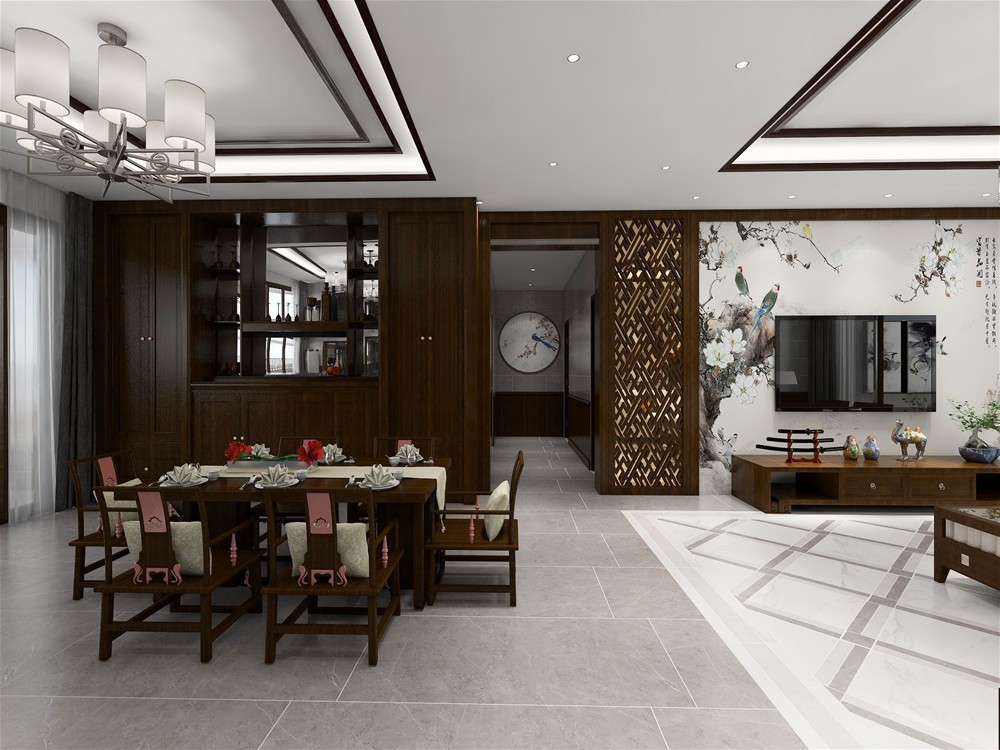 開放式的餐廳與客廳相連通,中間的走廊讓客廳、餐廳區域分明,餐廳矩形餐桌和復古的吊燈組合,天花是簡單的雕花,留住了中式韻味注入了新中式的創新元素。