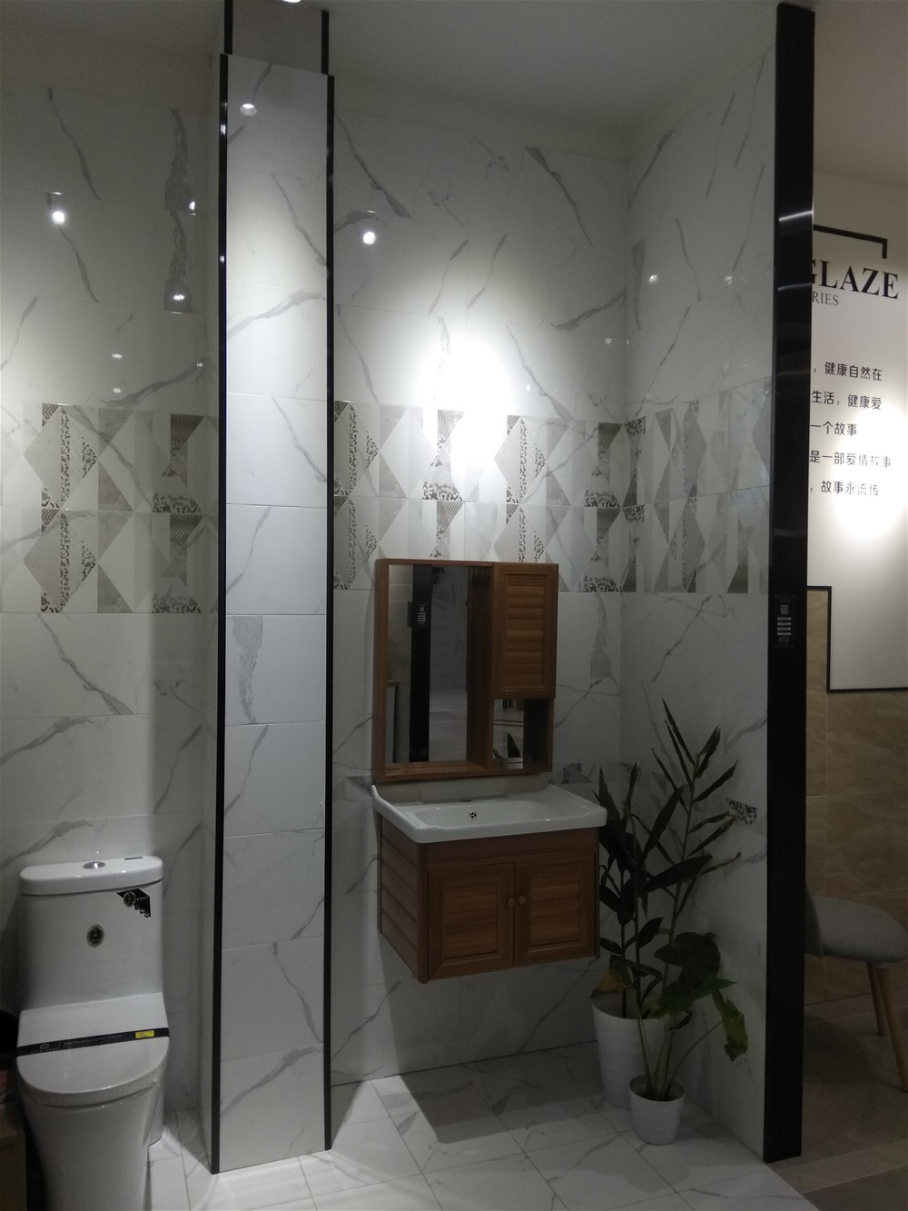 這是衛生間模擬間,瓷磚選用金艾陶噴墨瓷片,上墻下地都能鋪,顏色是今年流行的灰色調,一深一淺搭配出層次感,也不至于單調。這款瓷片也可作廚房用磚。