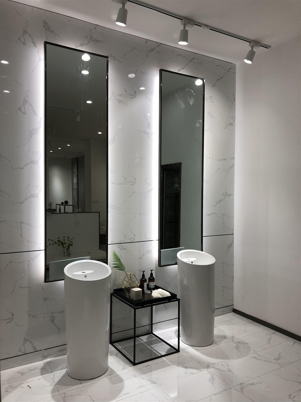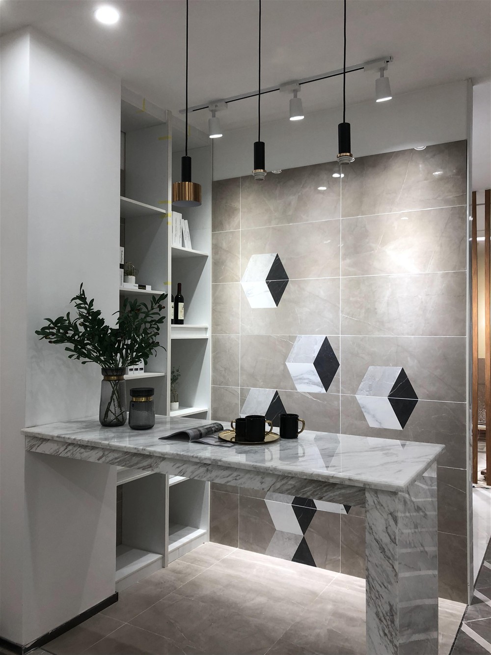 這是吧臺模擬間,由九面通體大理石和緞光釉不同規格、產品、顏色鋪貼的墻面,個性、時尚,搭配大理石吧臺和金屬軟裝,營造出輕奢的質感。