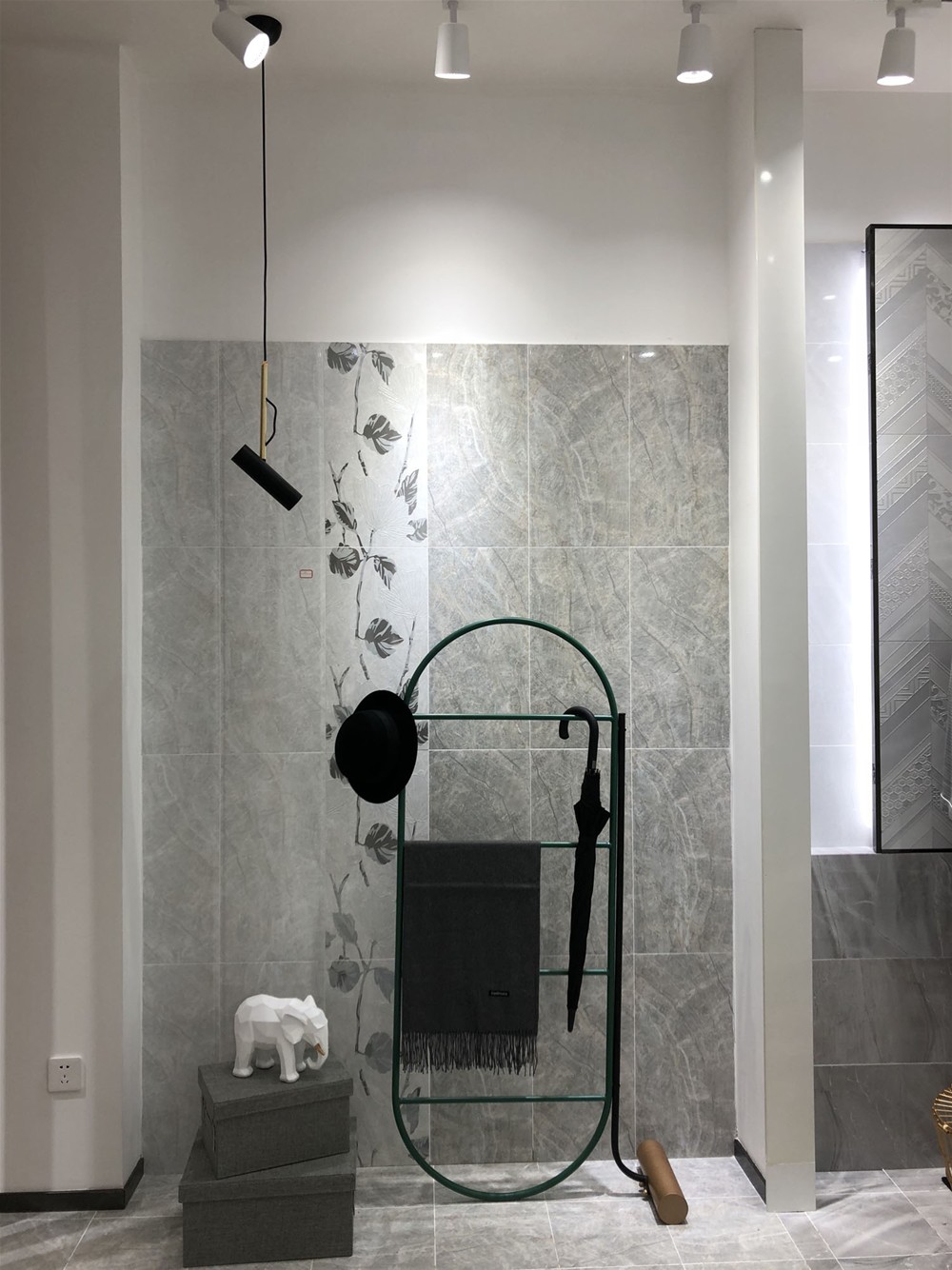 這是現代簡約風格衣帽間,前面三款由噴墨瓷片鋪貼而成,后面是由緞光釉鋪貼,沒有過多的切割加工,一深一淺,一素一彩簡單搭配,低成本講究實用性是現代簡約風遵循的宗旨。