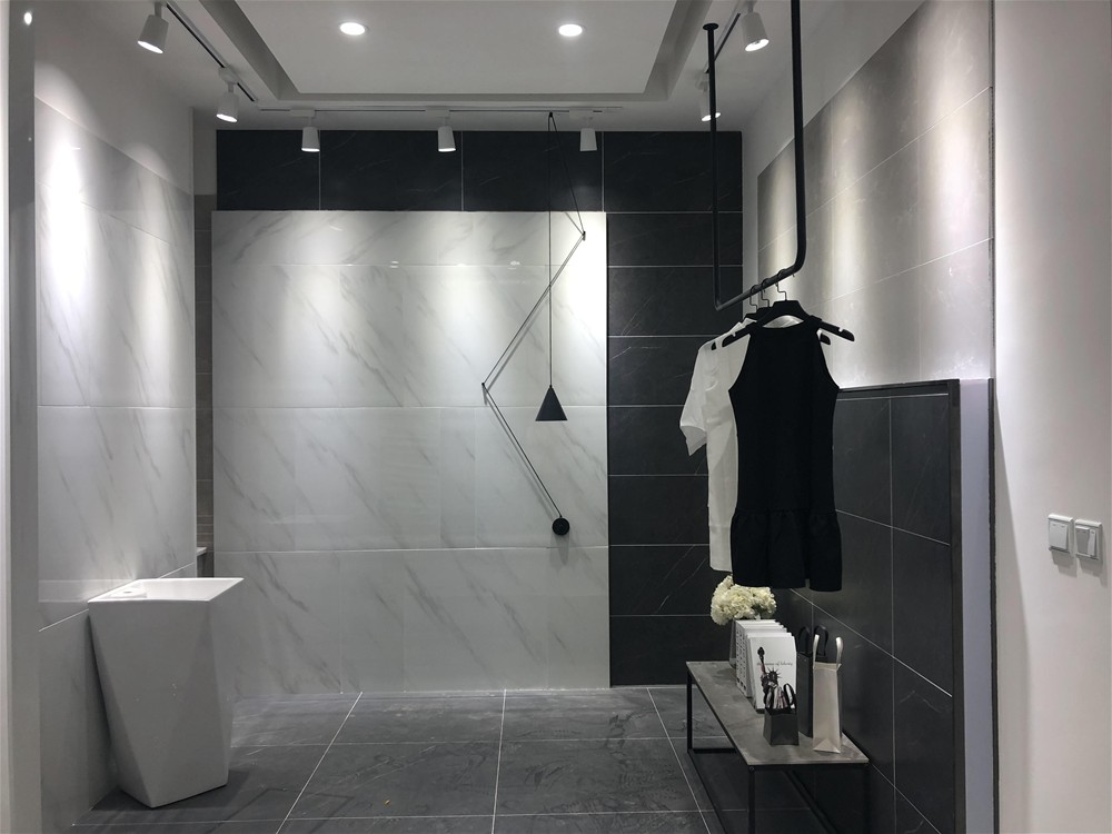 這是灰色調的衛生間模擬間,瓷磚選用通體大理石亮面磚,上墻下地都能鋪,現代簡約風和輕奢風都十分適用。