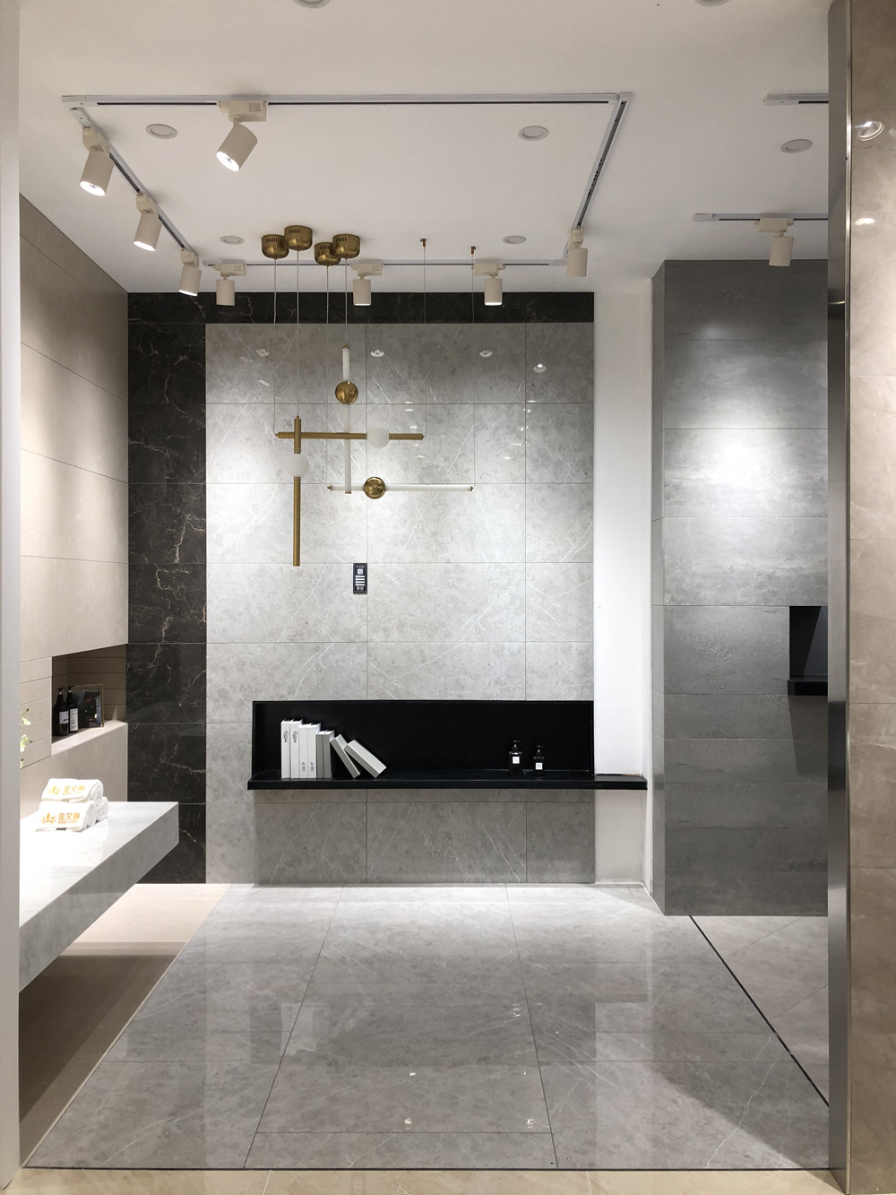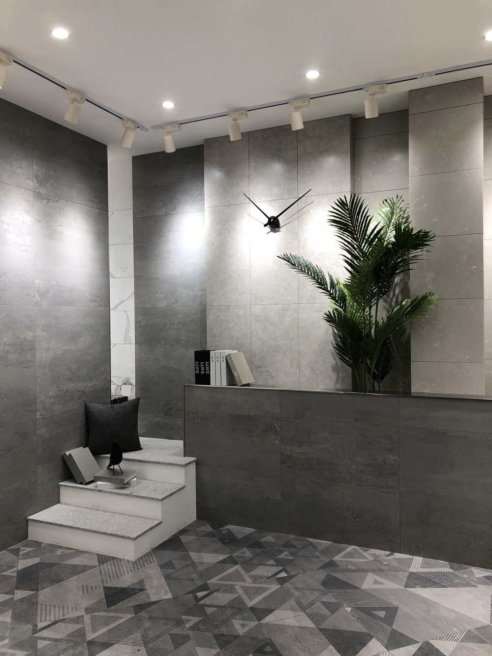 這是金艾陶浙江嵊州青春館的前臺,由灰色九面通體大理石鋪貼的背景墻,形象臺由緞光釉卡拉卡白鋪貼而成,可塑性非常強的一款產(chǎn)品。簡潔大氣的前臺延續(xù)了青春館的現(xiàn)代簡約風(fēng)格。
