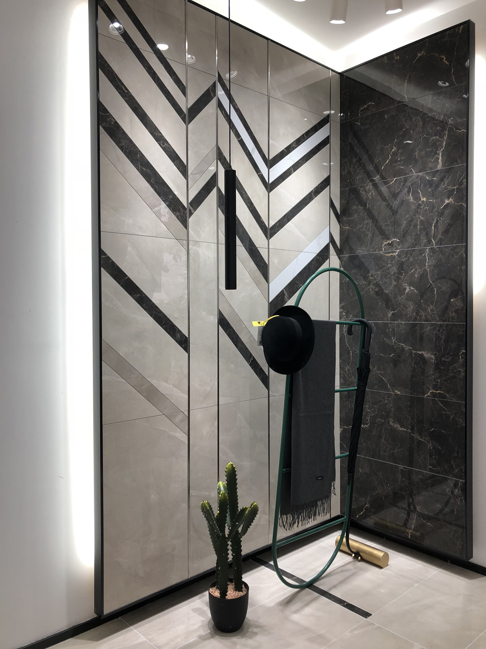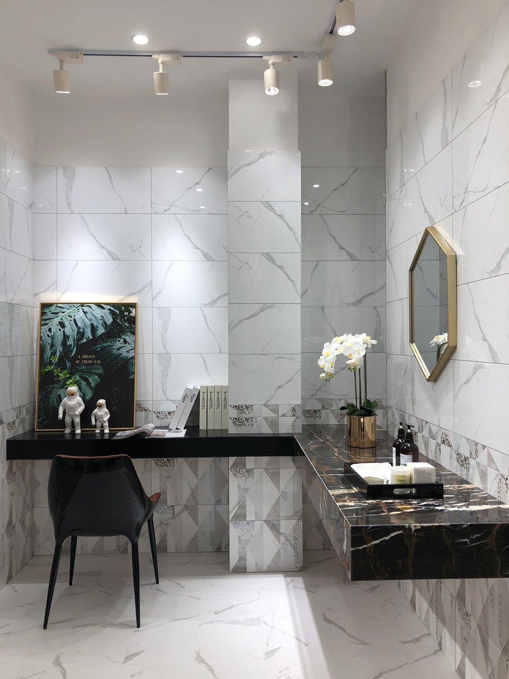 這是由噴墨瓷片鋪貼的書房,突出的墻面一堵是純色系、一堵是由花片鋪貼而成,讓空間有更多的變化的同時消費者也不會產(chǎn)生審美疲勞。