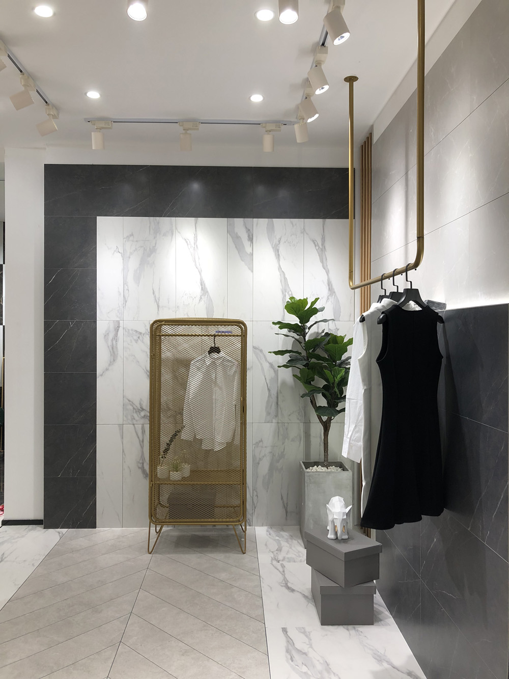 這是九面通體大理石鋪貼的現(xiàn)代簡約衣帽間,不同規(guī)格顏色的產(chǎn)品切割拼接出時尚個性的墻面,另一面墻是簡單的鋪貼,刪繁就簡。
