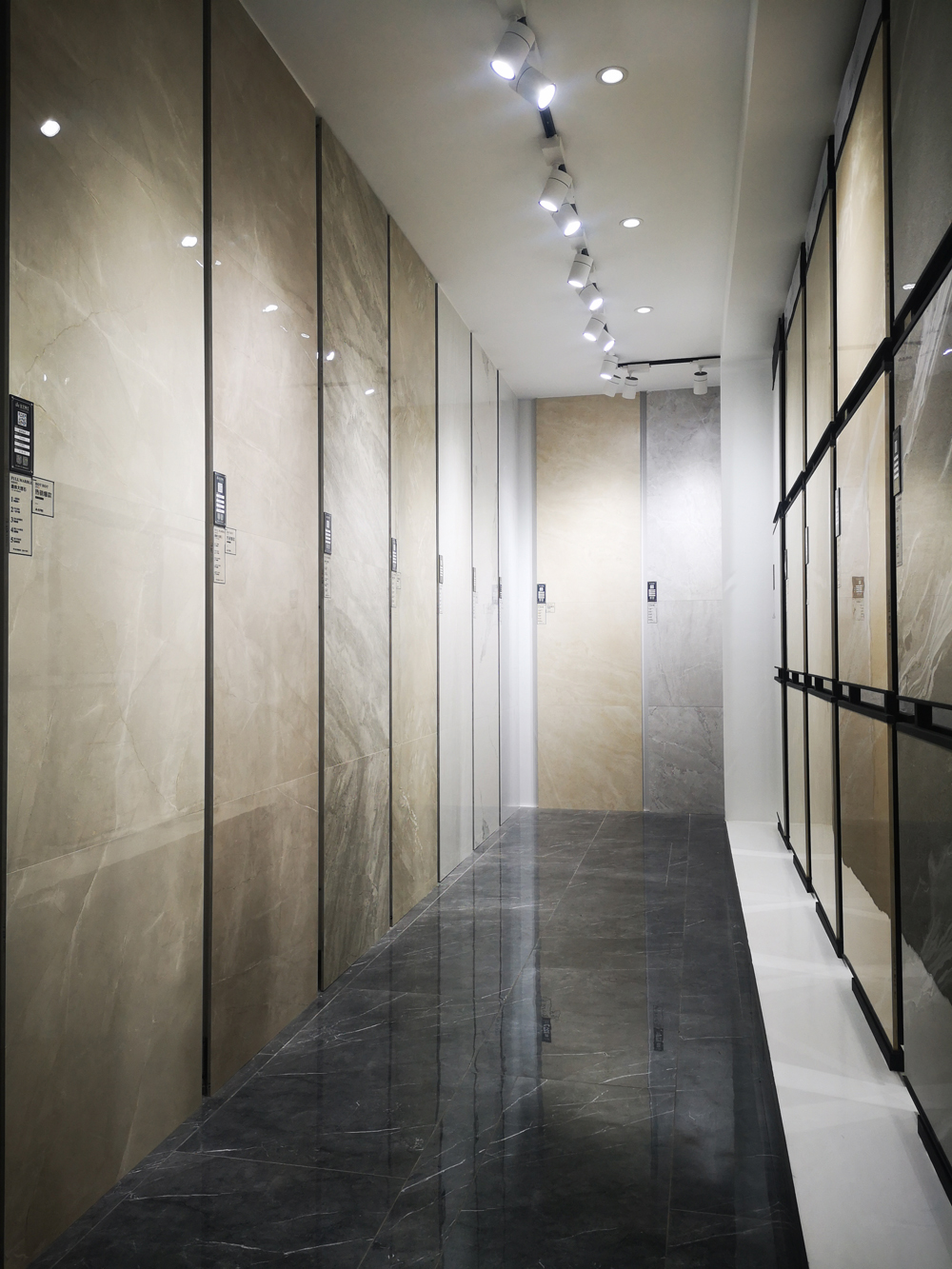 這是選材區,打豎的陳列方式射燈下的產品,直觀、整潔、大氣、很好地凸顯產品的紋理,推拉陳列方式主要針對噴墨瓷片,簡單一堵墻就能把噴墨瓷片的搭配、鋪貼、風格直觀呈現。