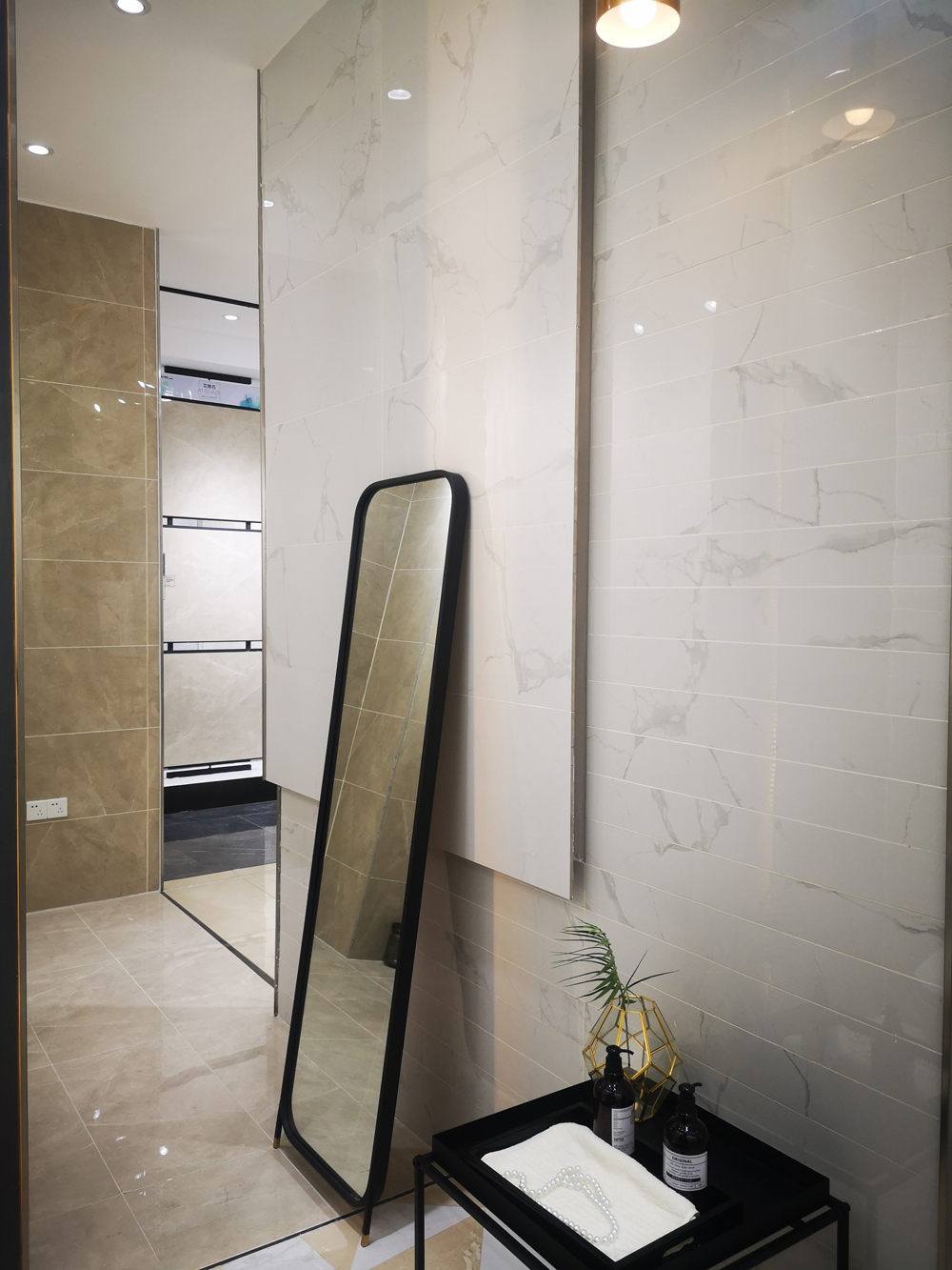 這是由新品通體大理石KTA9818、KTA9819鋪貼的墻面,沒有更多造型,簡單的瓷磚切割鋪貼,優雅大氣的空間氛圍呈現眼前。