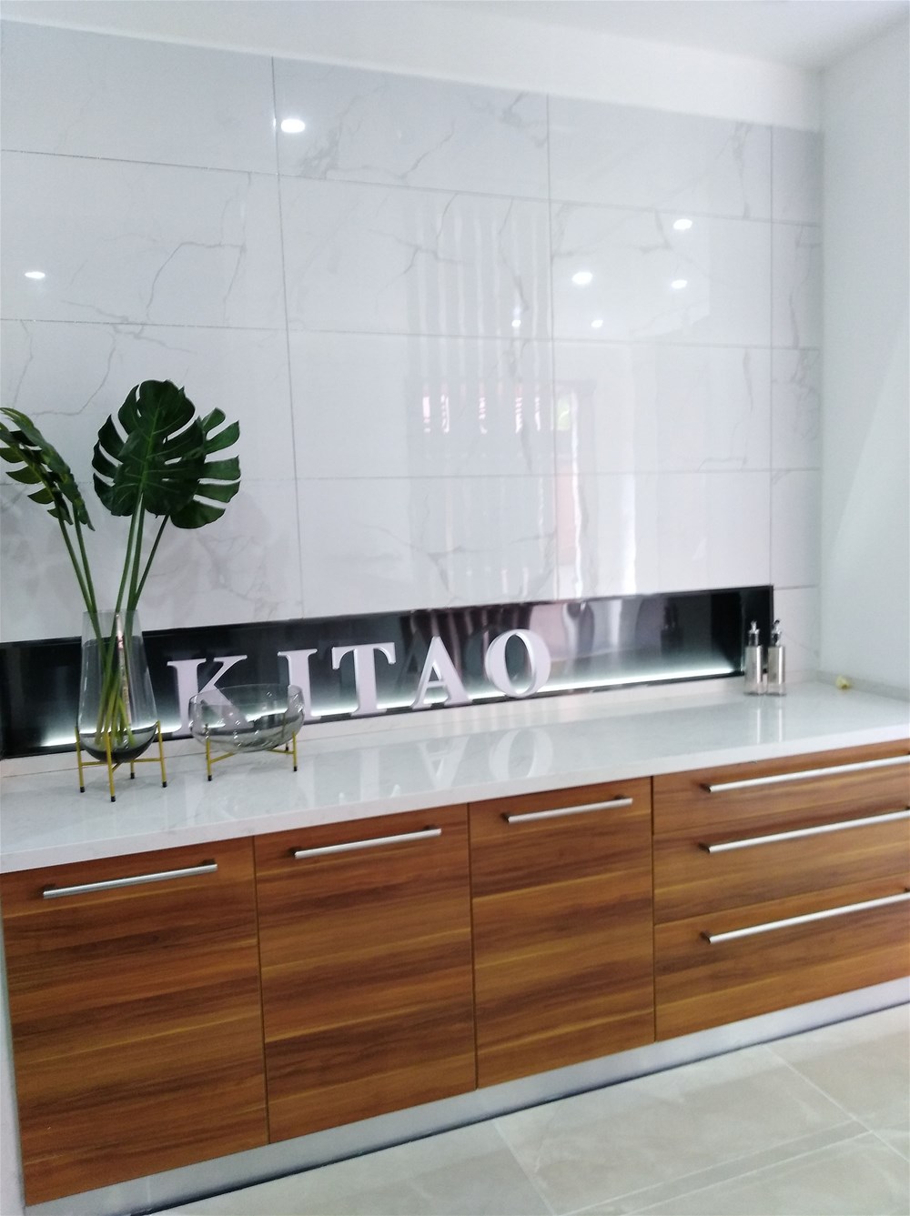 這是我們的前臺,背景墻由九面通體大理石KA9M61209尼泊爾灰單獨(dú)鋪貼,大氣、簡潔,這款磚也非常適合客廳電視背景墻、地面鋪貼使用,不知道您覺得怎么樣呢?
