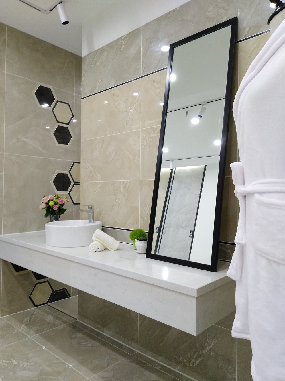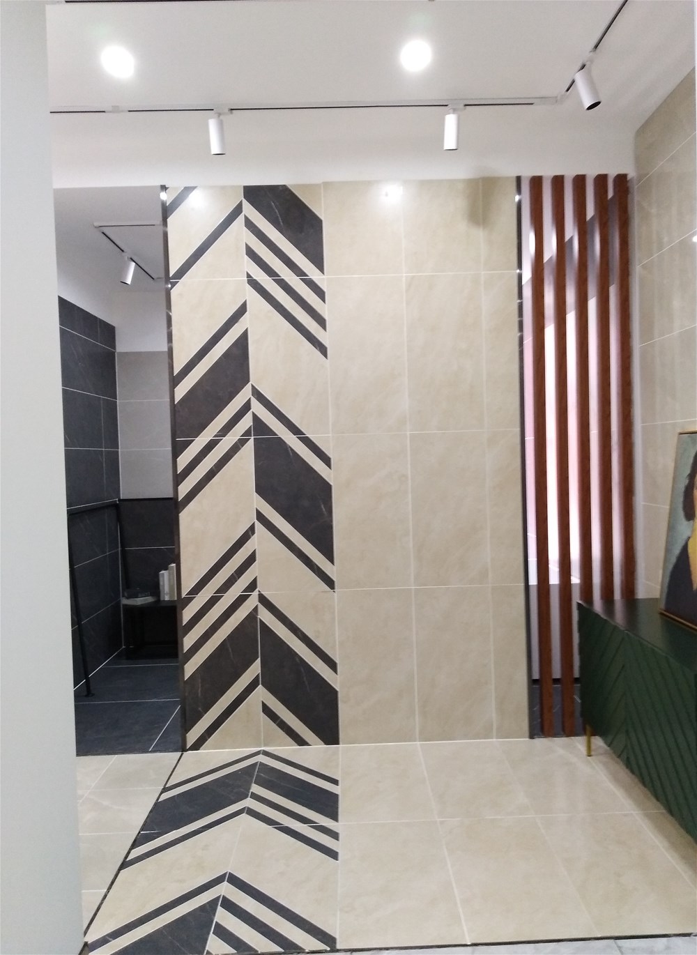 這邊走,這是我們的選材區(qū),規(guī)格、款式、風(fēng)格一應(yīng)俱全,通過射燈照射下的磚面紋理是不是清晰多了?如果您現(xiàn)在還不知道自己要選什么產(chǎn)品,看完我們的模擬間你或許就能找到方向了。