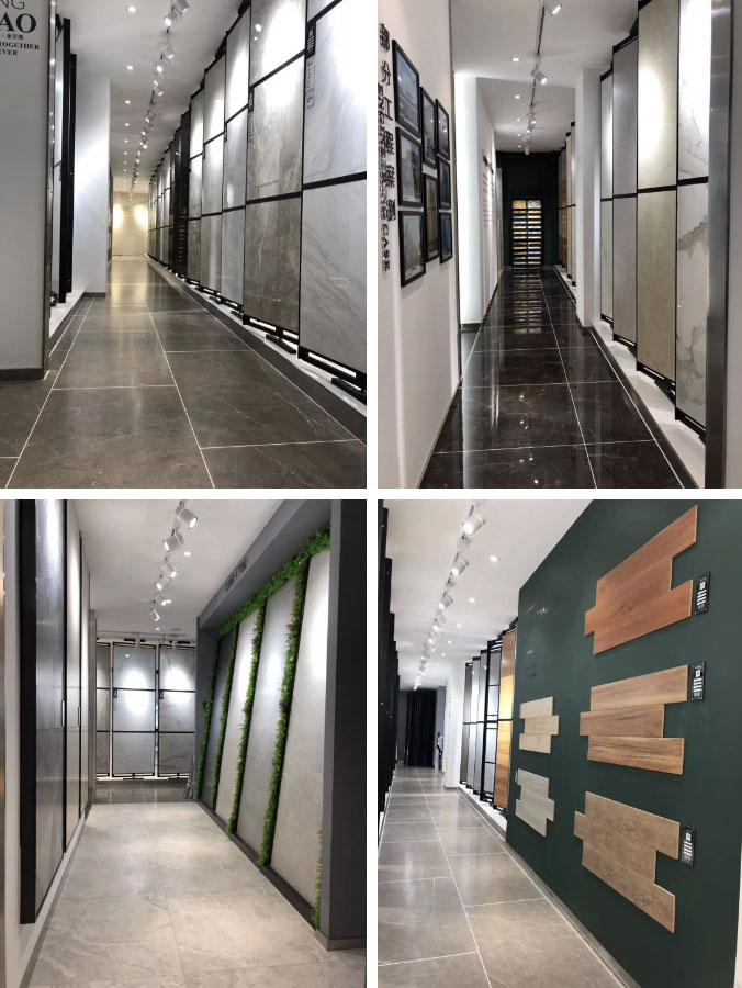 這是我們的選材區,暢銷的通體大理石、護眼15°緞光釉、健康艾釉石、防滑現代仿古磚、瓷拋磚、拋光磚、配套噴墨瓷片、木紋條等200多款瓷磚花色,全屋配套沒問題。