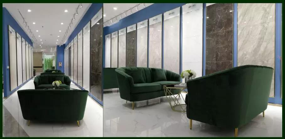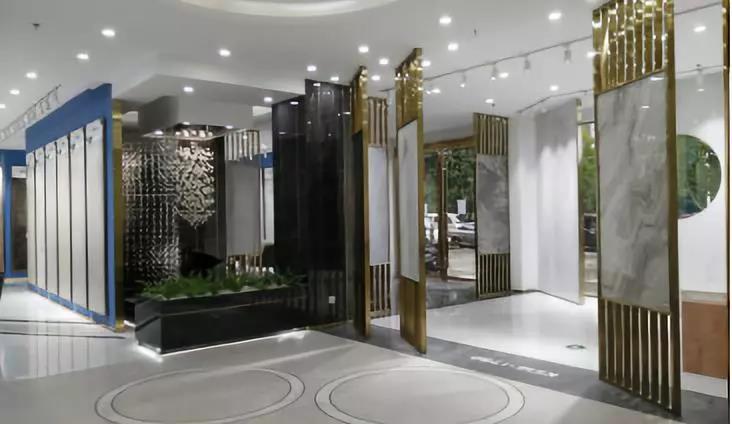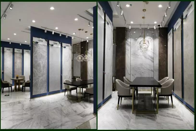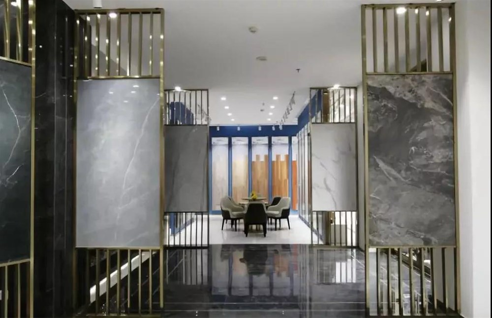 900*1800的大板以屏風的形式展現(xiàn),不但很巧妙的體現(xiàn)了大巖板系列產(chǎn)品的紋理和設(shè)計感,而且通過系列的屏風展示很巧妙的把大堂區(qū)域兩邊劃分為接待區(qū)和洽談區(qū),靜/動兩個區(qū)。