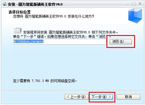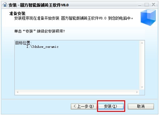 例如:假設要選擇I盤,點擊“瀏覽”,選擇I盤(安裝完畢后會在I盤生成3dshow_ceramic文件夾,軟件的所有文件都保存在這里)