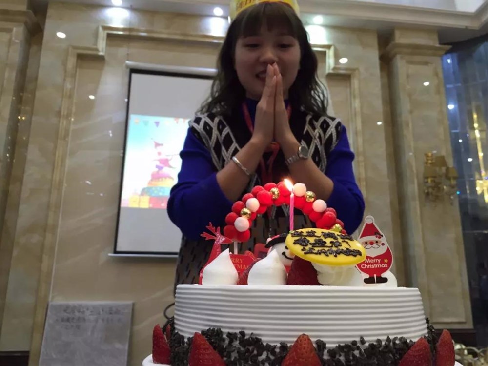 噔噔,接下來(lái)就到我們的壽星公登場(chǎng)了——助銷(xiāo)小仙女-黎小美在全體公司同事的祝福下,許下心愿切蛋糕。