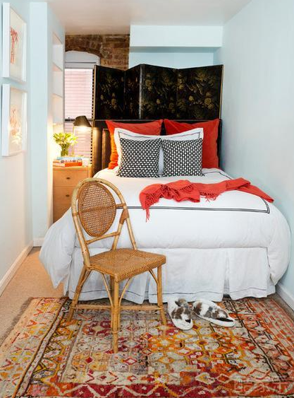 全白當(dāng)然是小臥室最好的選擇,但是你也可以在謹(jǐn)慎的考慮過(guò)后,添加一兩種自己喜歡的色彩。如圖中,用少量的紅色和橙色,搭配做工精美的磚墻和木制家具,作為白色墻壁最好的點(diǎn)綴,營(yíng)造輕松的居住氛圍。