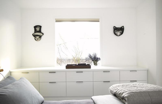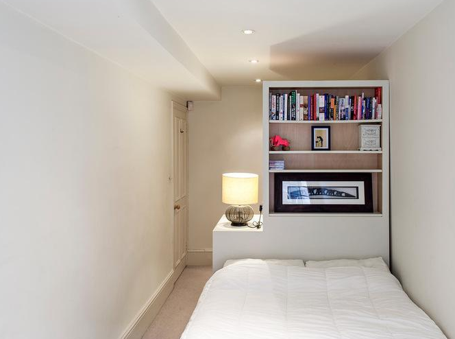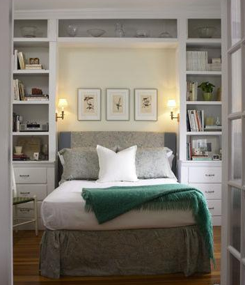 如圖的臥室設(shè)計(jì)巧妙地結(jié)合了空間來(lái)展示珍品,貨架上可以擺放書(shū)籍,抽屜在用來(lái)存放更多的個(gè)人物品的同時(shí)還充當(dāng)了床頭柜。