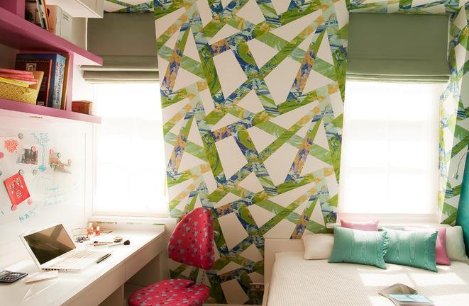 在一個(gè)擁擠的空間里,在墻上涂鴉或是貼上壁畫(huà),盡顯主人的風(fēng)格個(gè)性。圖中漂亮的墻紙?jiān)O(shè)計(jì)連接著淡藍(lán)色的墻壁,提升了整個(gè)臥室空間的凝聚力,讓臥室更有個(gè)性。