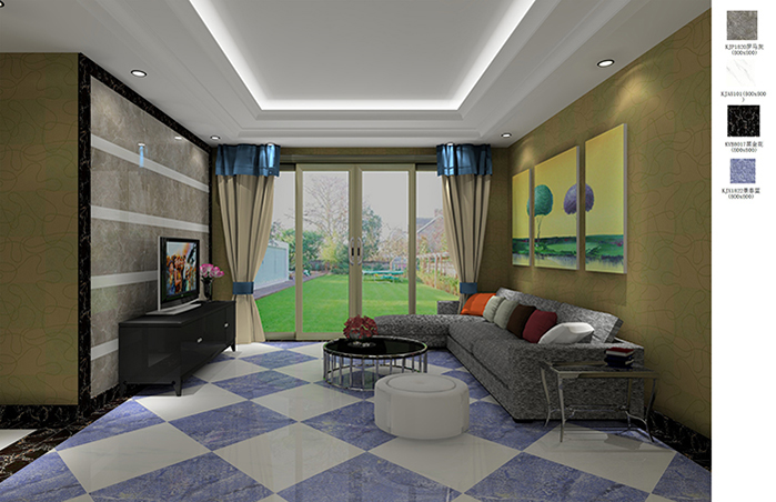 地面以藍、白色為主,給人一種小清新的感覺。在瓷磚的鋪貼方式上也蠻是新意,地面的菱形鋪貼,電視背景墻的寬、窄長條形鋪貼,讓家不在顯得單調無味。