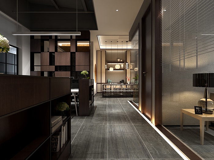 簡約別致的家具與現代仿古磚極為相配,不規則的紋理質感營造出寧靜致遠的空間效果。