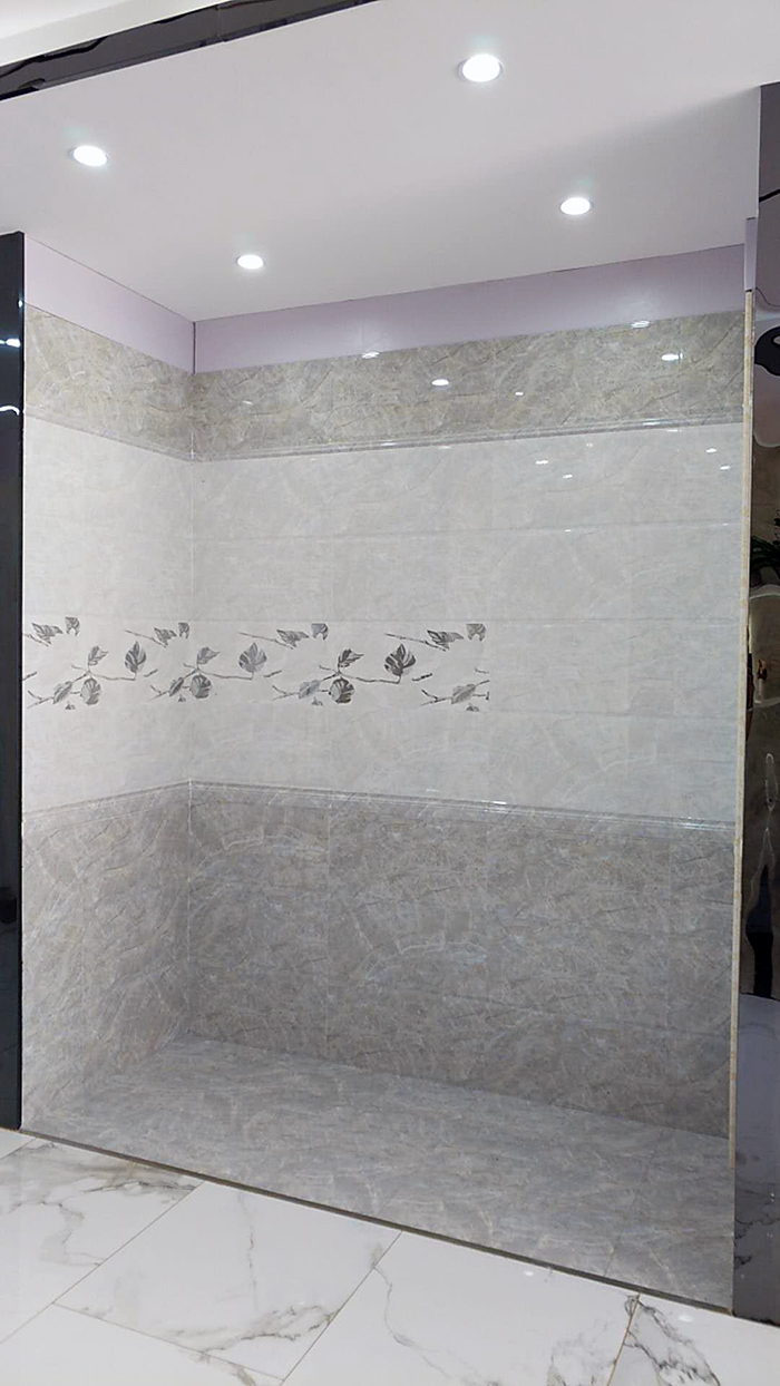 瓷片空間的鋪貼效果往往和花片的搭配有很大關系,此空間的葉子花片,讓整個空間多了幾分色彩,不顯單調。