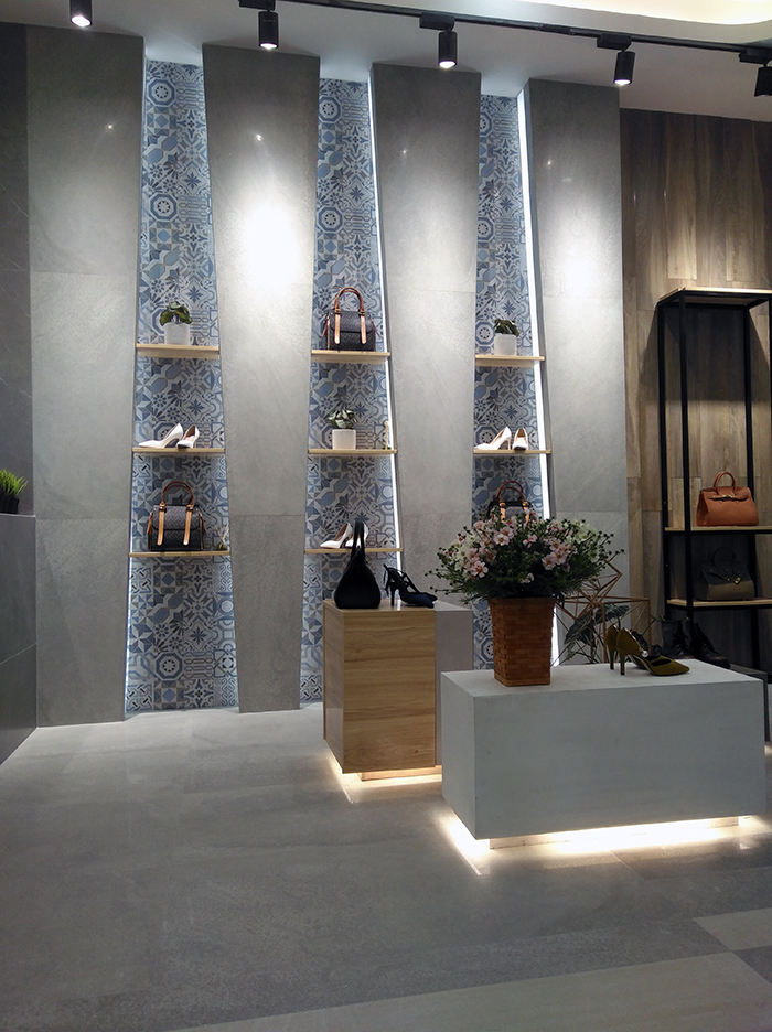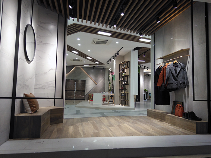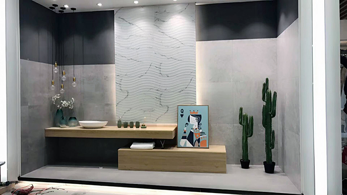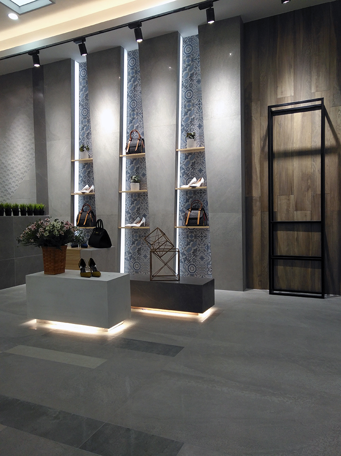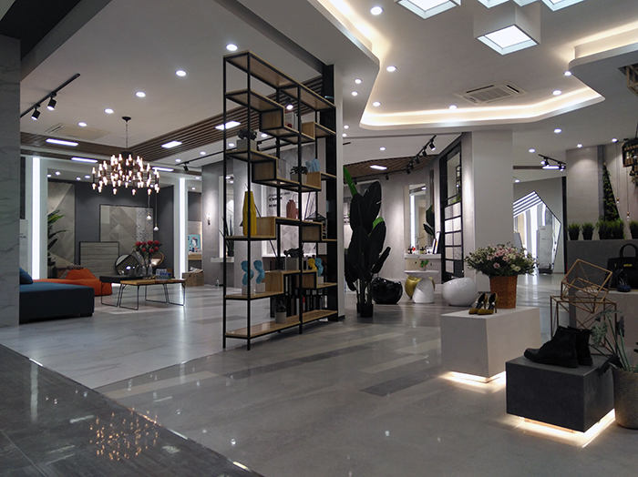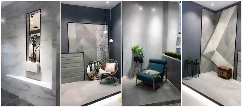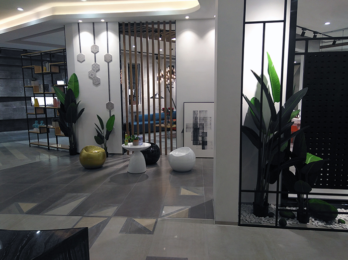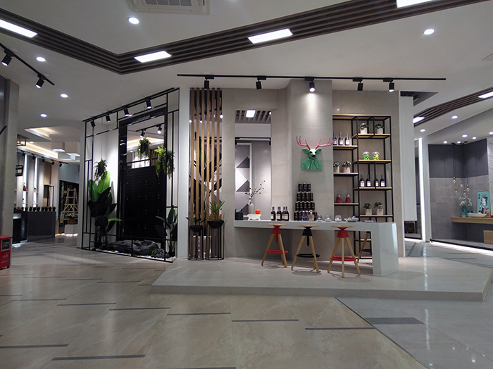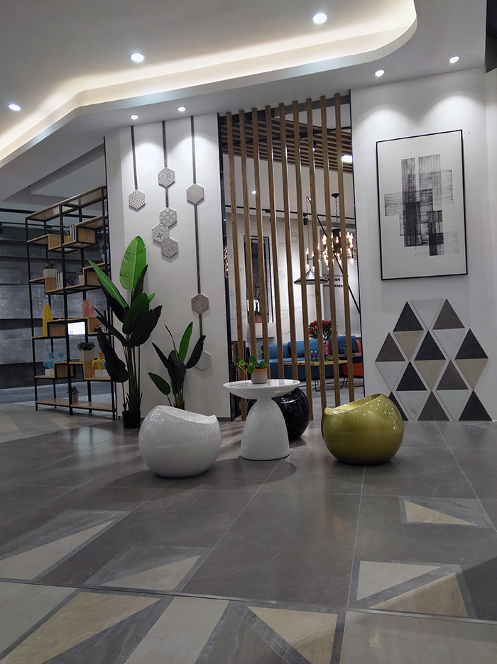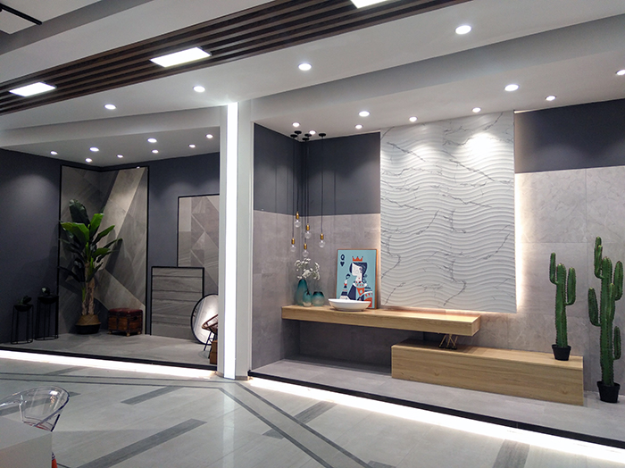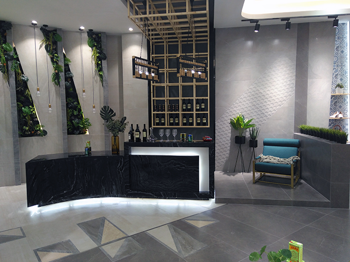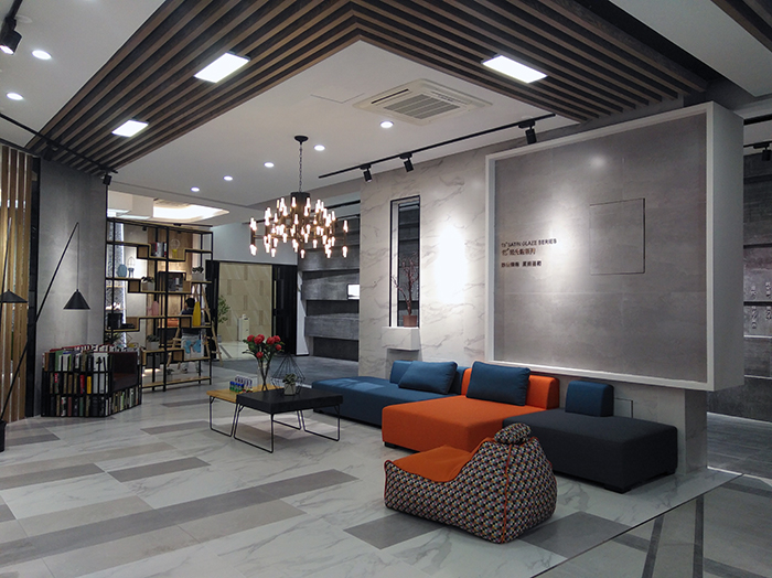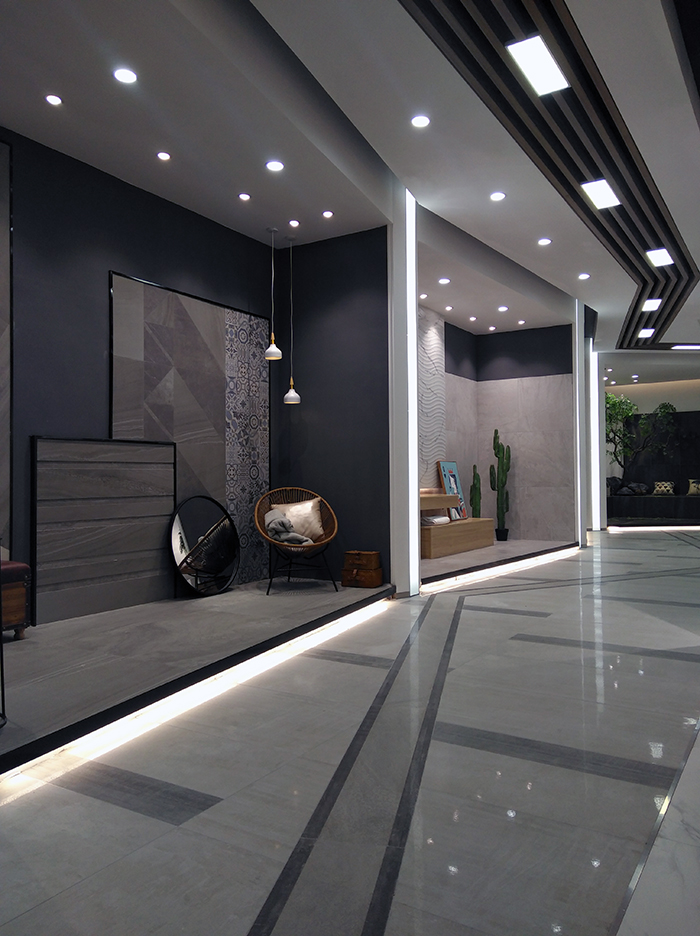 新展廳主要運(yùn)用現(xiàn)代仿古磚阿瑪羅尼、15°緞光釉產(chǎn)品,主打現(xiàn)代簡(jiǎn)約風(fēng)格,個(gè)性獨(dú)特的燈飾,沉穩(wěn)大